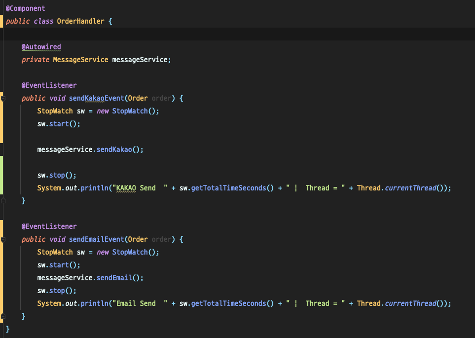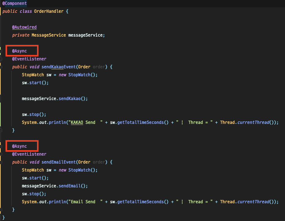 우선 각각의 @EventListner 위에 @Asnyc 어노테이션을 붙여주었습니다.