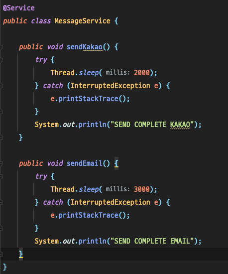 MesaageService에 푸시 기능을 하나 만들어줍니다.해당 메서드는 무조건