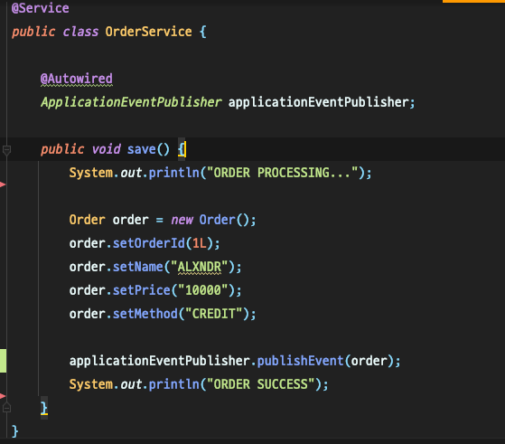 @Service public class OrderService { @Autowired ApplicationEventPublisher applicationEventPublisher; public void save() { System.out.println("ORDER PROCESSING..."); Order order = new Order(); order.setOrderId(1L); order.setName("ALXNDR"); order.setPrice("10000"); order.setMethod("CREDIT"); applicationEventPublisher.publishEvent(order); System.out.println("ORDER SUCCESS"); } }이벤트를 발행한 후 Order Success라는 문장을 출력하게 했습니다.
