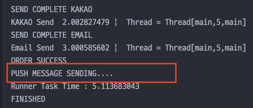 @EventListener public void sendPushEvnet(Order order) { messageService.sendPushMessage(); }위에서 만든 푸시 기능을 호출하는 이벤트를 만들어주고 실행해보겠습니다.