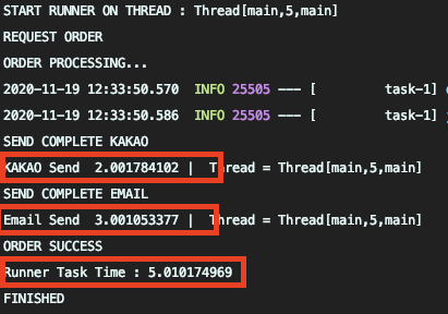 위와 같이 수정한 후 실행해보면 로그가 정상적으로 출력되고 주문 기능도 정상적으로 종료되었음을 확인할 수 있습니다.