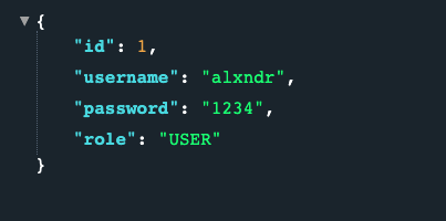 서버를 구동하여 지난 번글과 같이 http://localhost:8080/account/USER/alxndr/1234 유저를 등록해보면