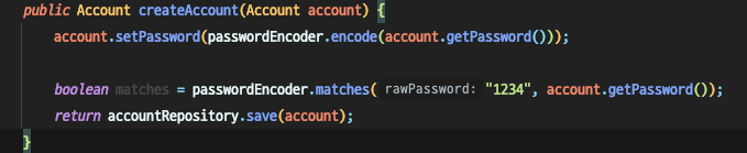 - Bean으로 등록한 PasswordEncoder를 AccountService에서를 생성자주입방식으로 주입받습니다.