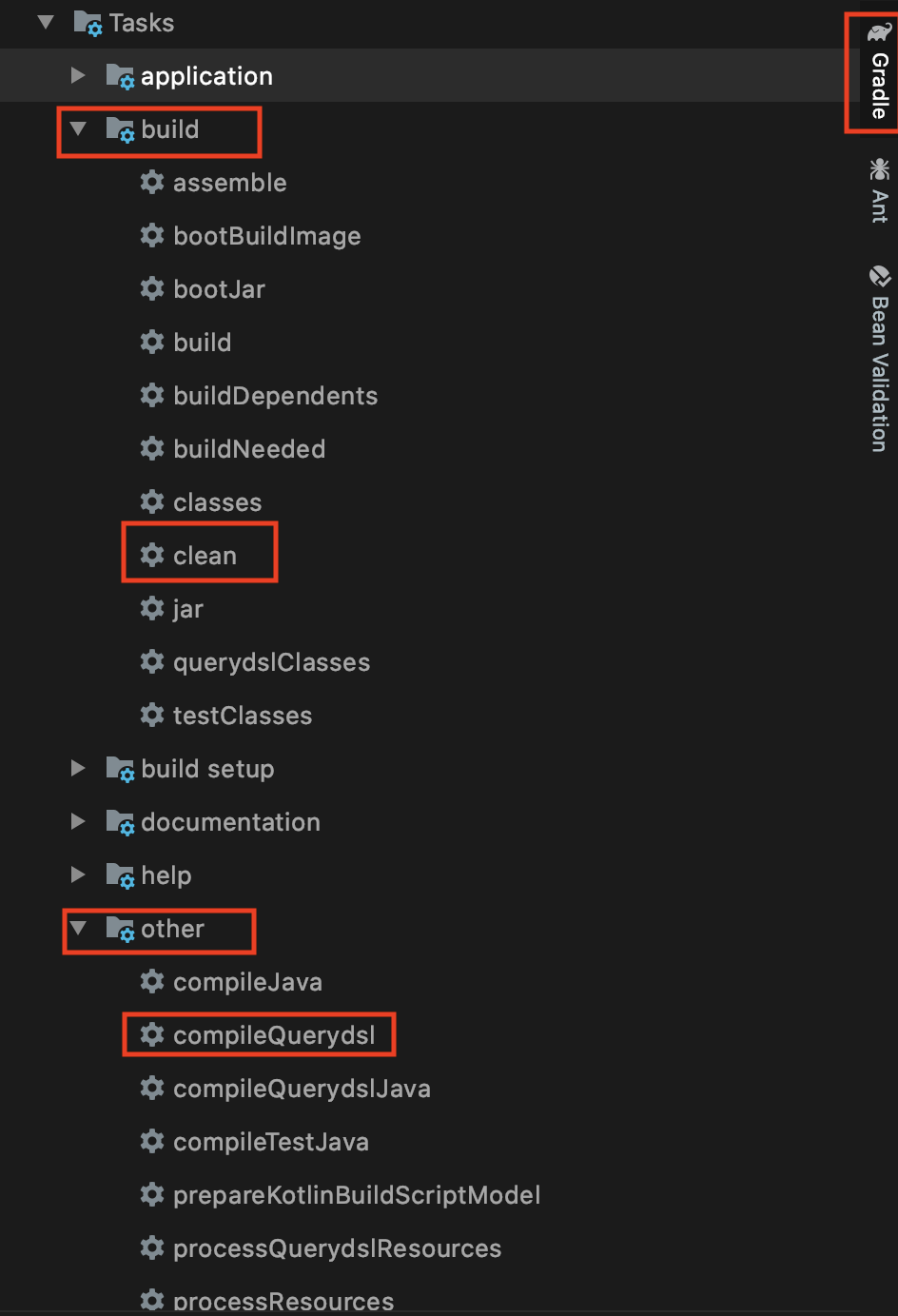 Gradle→Tasks→build→cleanGradle→Tasks→others→compileQuerydsl